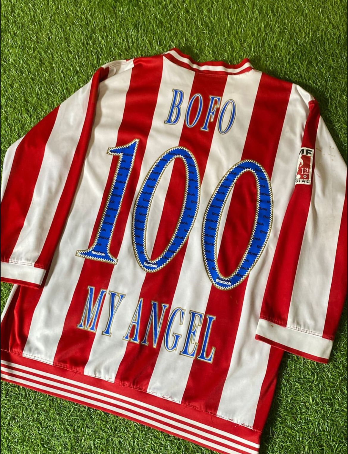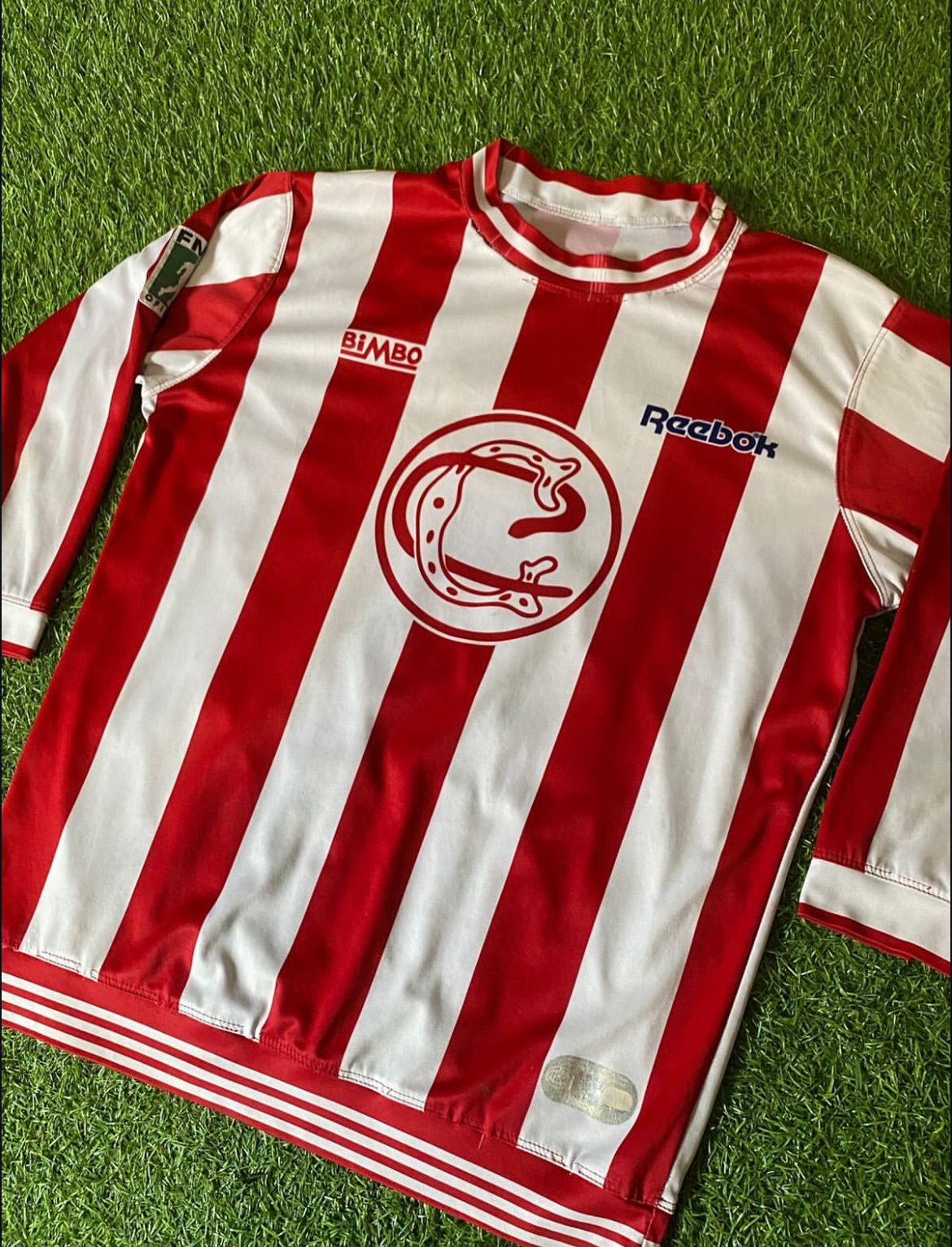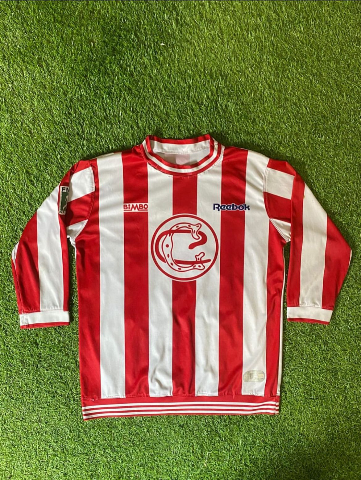 Jersey Centenario 2006 Chivas, dorsal de Adolfo Bautista, tiene algunos jalones en el cuello y una mancha al parecer de pegamento por encima de el parche FMF