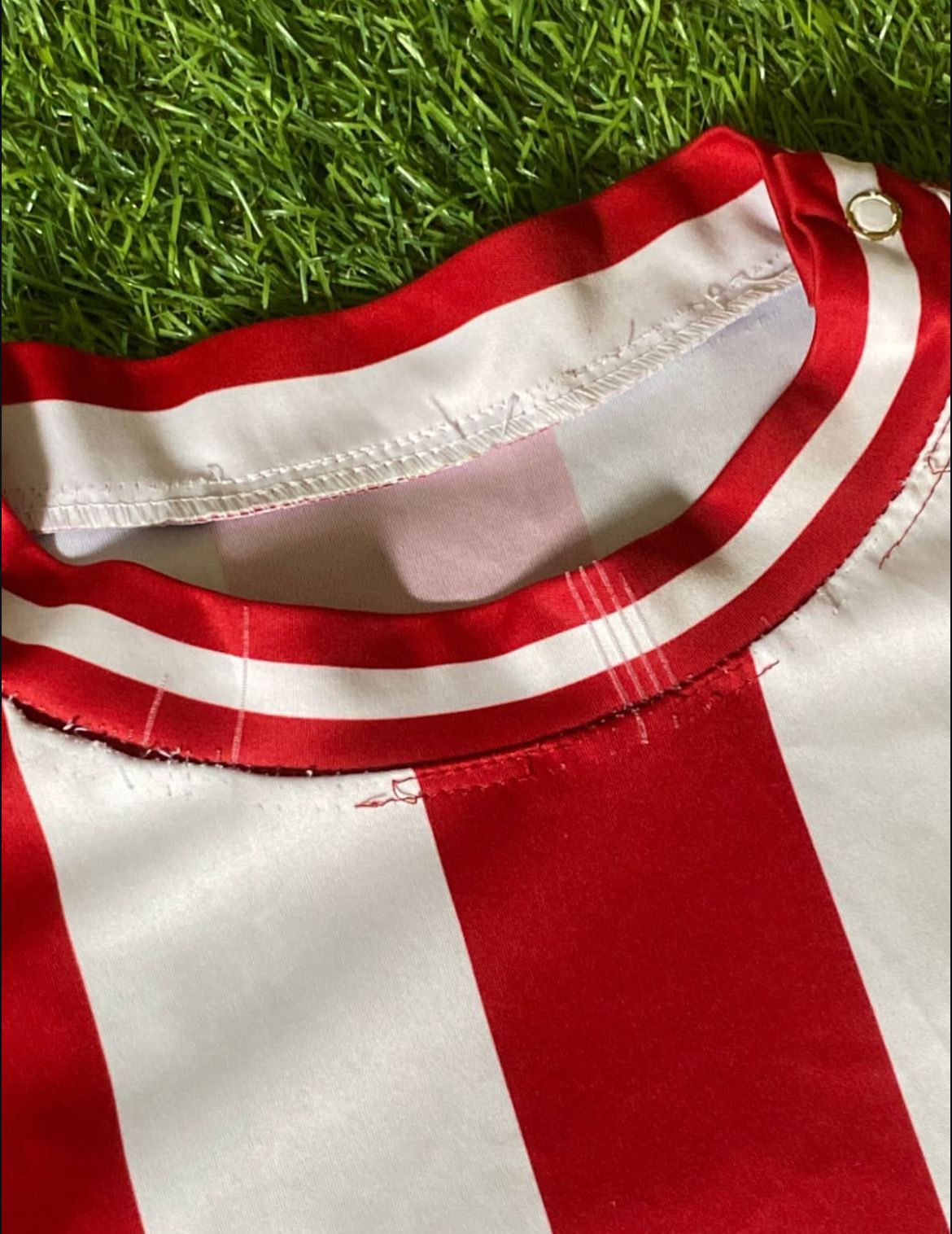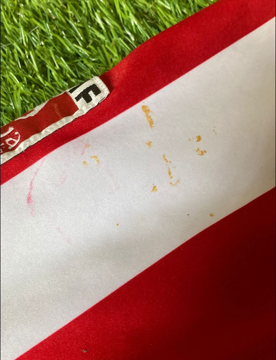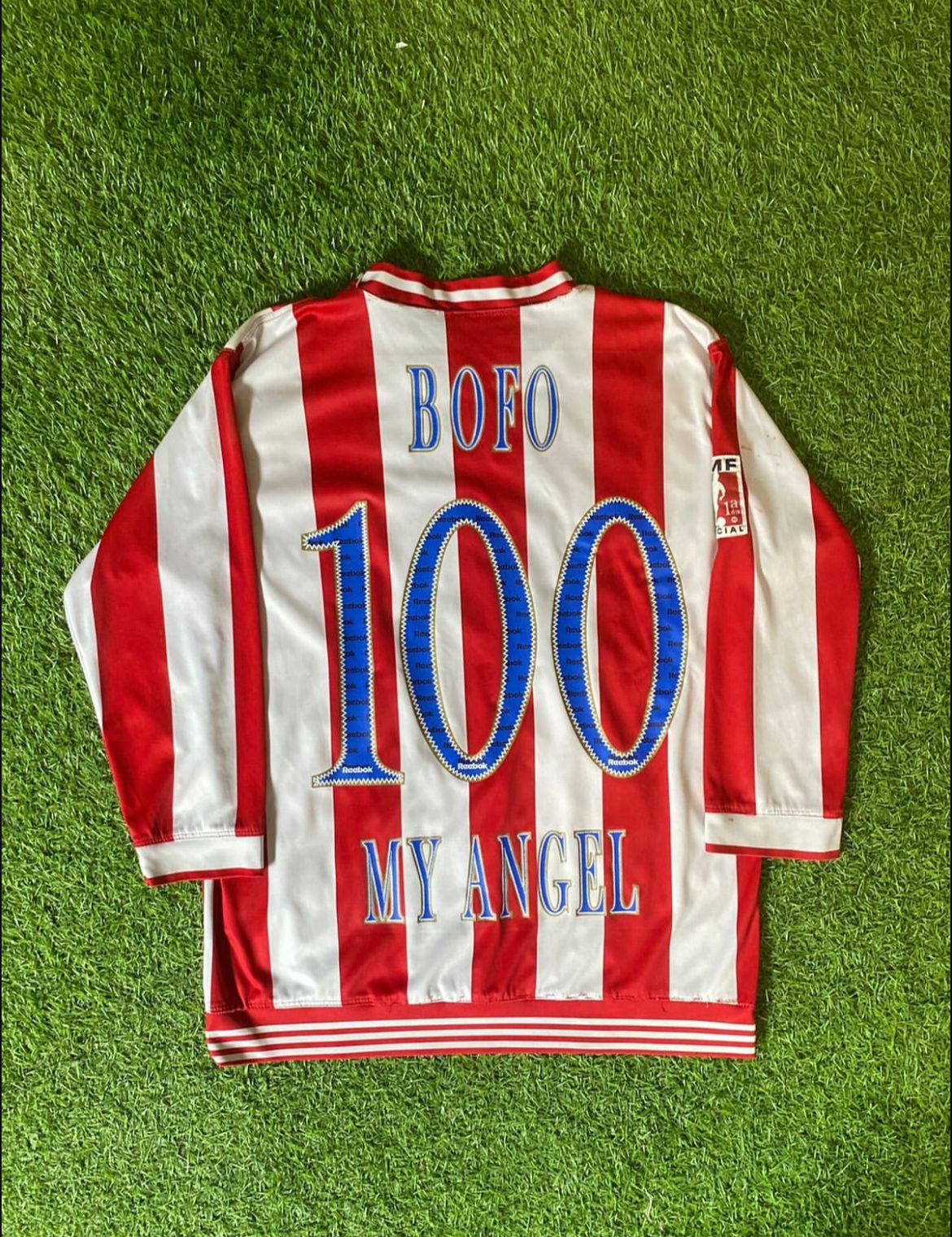 Jersey Centenario 2006 Chivas, dorsal de Adolfo Bautista, tiene algunos jalones en el cuello y una mancha al parecer de pegamento por encima de el parche FMF